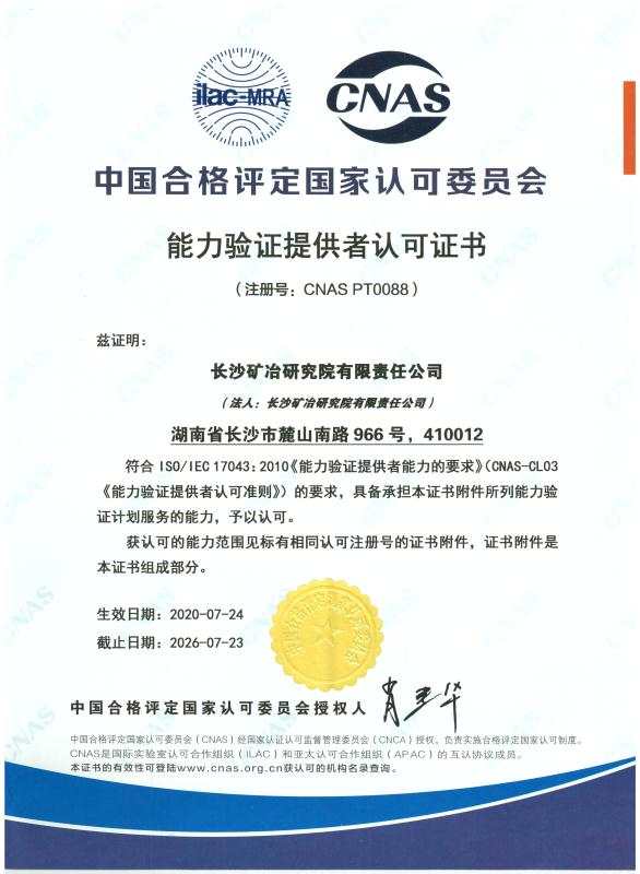 长矿检测公司是目前湖南省唯一一家中国合格评定国家认可委员会(CNAS)认可的能力验证提供者(证书编号:CNAS PT0088),资质范围涵盖矿石、锂电材料、土壤、水样、钢铁合金测试等多个领域,可提供氢氧化镍钴锰、镍钴锰酸锂、碳酸锂、铁矿石、铜铅锌矿等十余种产品的化学成分及粒度与比表面测试能力验证和测量审核服务。