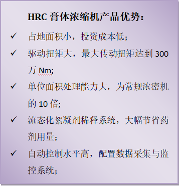 HRC型膏体浓缩机:公司自主研发的HRC型膏体浓缩机系列产品(ZL 201520105189.0),可用于矿山尾矿的全尾膏体浓缩充填或干堆干排,膏体浓缩机最大直径可达40m,底流浓度最高可达73%,已经建成了多个工程案例。